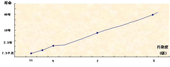 世界各研究機(jī)構(gòu)在進(jìn)行研究污染度對(duì)壽命的影響時(shí),所給出的研究結(jié)果差異很大,這主要是因?yàn)楣ぷ鳝h(huán)境、污染物成分及顆粒硬度等因素不同的結(jié)果。一般來說(以NAS1638標(biāo)準(zhǔn)),污染度降低一級(jí),壽命延長(zhǎng)一倍,反之亦然。假定使用污染度為7級(jí)(NAS1638)的油液,機(jī)器的壽命為10年,同樣是這樣一臺(tái)機(jī)器將油液的污染度降低幾級(jí),壽命就有驚人的變化。